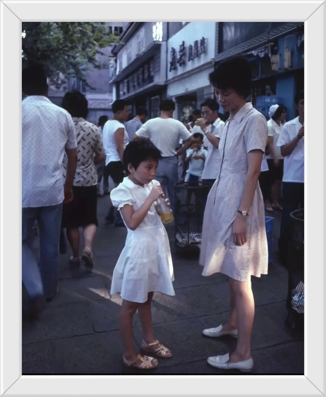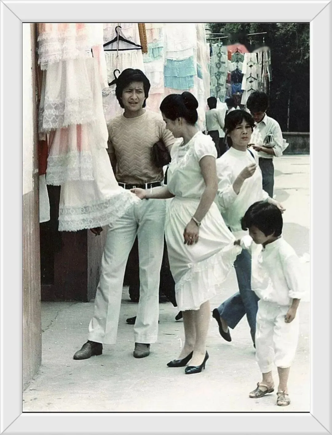 80年代的温州,人们的衣着打扮都很时髦,一个妈妈看中了一件连衣裙,小男孩却揪着妈妈的衣裙要走。
