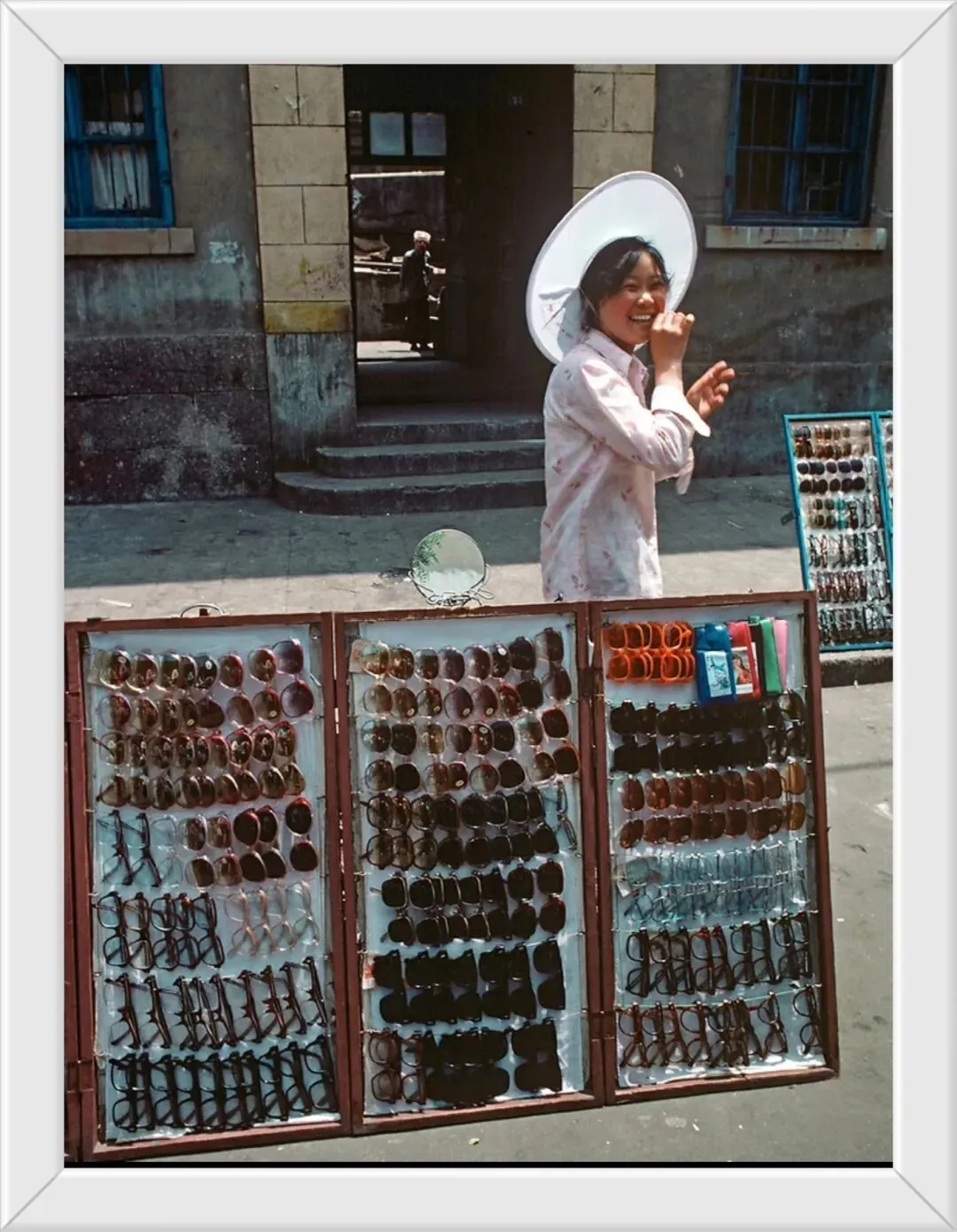 1985年的青岛街头,卖墨镜的摊位比较多,海边沙滩游玩的男士女士几乎人人一副,因为很流行。