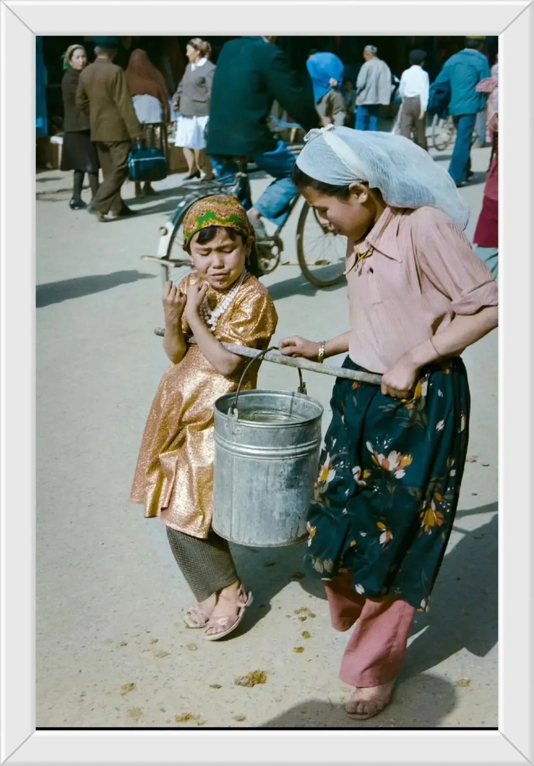 1986年的新疆喀什,一个小朋友在帮妈妈抬水。