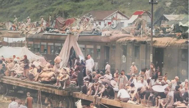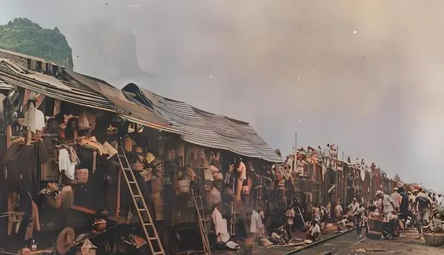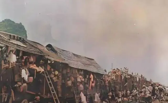 车顶上这些棚子叫临时厢房,木梯一搭,人往上窜,草席压在铁皮上,日头晒得烫,大家还是要在上面支个小灶,锅冒的白气混着煤烟,味儿冲得眼睛发酸,晚上风一大,篷布呼啦啦响,谁都不敢睡死。