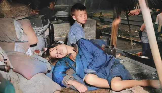 这张是困乏照的,破棉被糊着身,孩子靠着木箱打盹,耳朵边上就是铁轨的叮当,睡着也像醒着,人一挤过来就得撑肘爬起来,棉被有股潮味,怎么晒都散不掉。