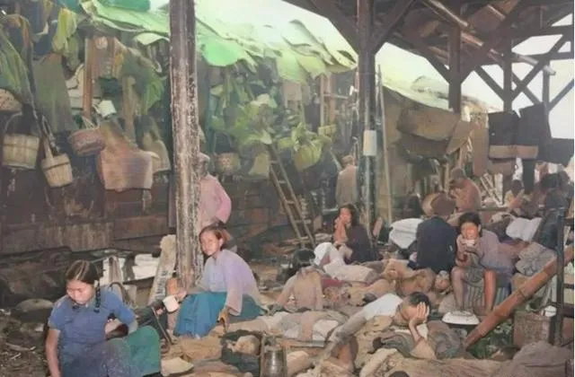 图中这一大摊儿是临时堆场,叫逃难人的“家当坪”,木棚下黑压压全是人和行李,扁担竹篮油纸伞挤成一片,木柱子上挂满蓑衣和草帽,吵嚷声里夹着孩子哭,谁家都说不清自己那口锅塞在哪了,妈妈说别找了先占个角落,风一进来就满嘴土。