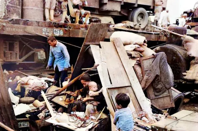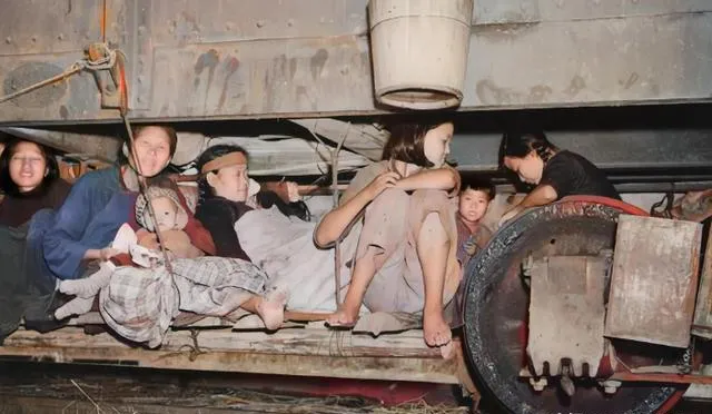 1944年广西大逃难老照片,火车车底睡人,年轻的妈妈眼神呆滞。