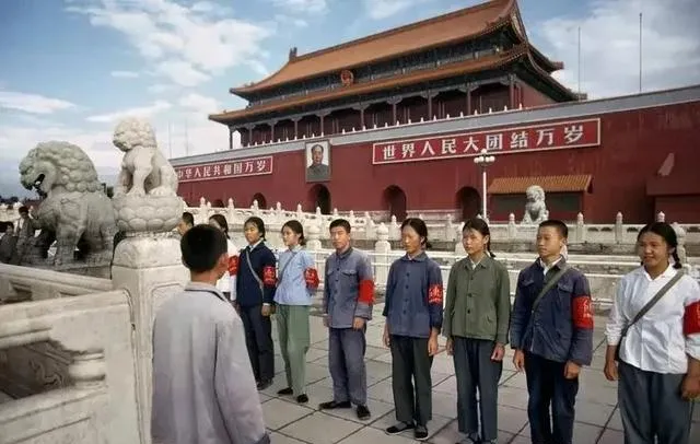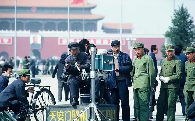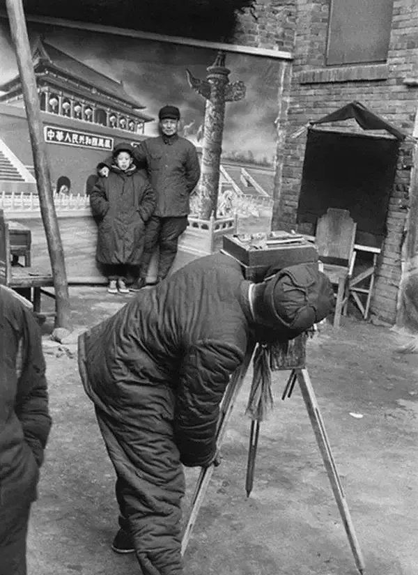 这个背景板叫天安门幕布,那会儿进城不容易,照相馆就把大幕一挂,远处画着红墙金瓦,脚边摆个三脚架,师傅蒙着黑布往镜头里瞄半天,咔嚓一声,家里人就把照片夹在玻璃柜里头,逢年过节拿出来擦一擦,跟真去过似的。