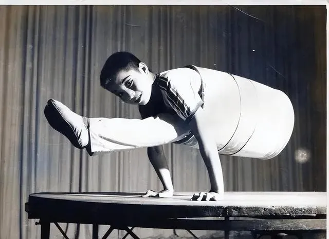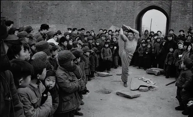 图里这门表演叫胸口碎大石,一人仰躺,一人抡大锤,石头劈开那一刻,围观的孩子吸冷气的声音我现在还记得,锤子沉,落点准,全靠练家子硬功夫,旁边还有软功,一抬腿能把脚背勾到脑后,真是又惊又服。