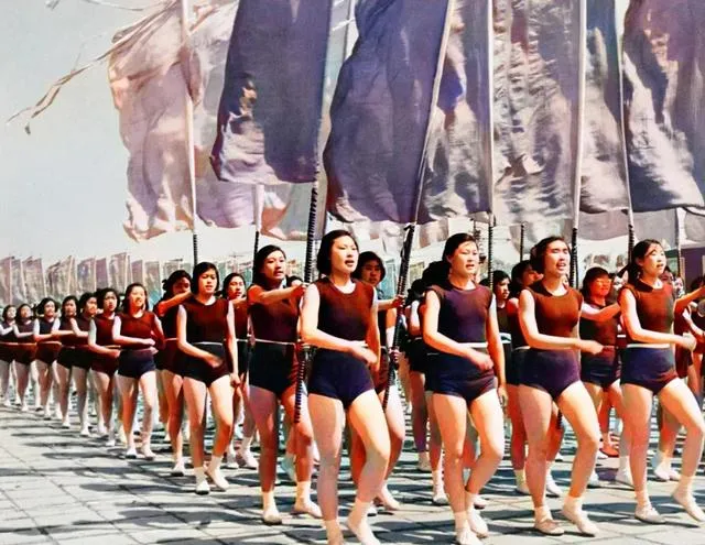 这张照片里头的活叫杀年猪,两位女子按手握刀,旗袍上水渍一片,人一点没含糊,手起刀落利索干净,旁边大木桶咕嘟咕嘟,邻里围了一圈,谁说女人家只能绣花,那时候一句女性也能顶半边天不是嘴上说着玩的,操场上的队列也是她们的主场,步子齐,胳膊抡得笔直。