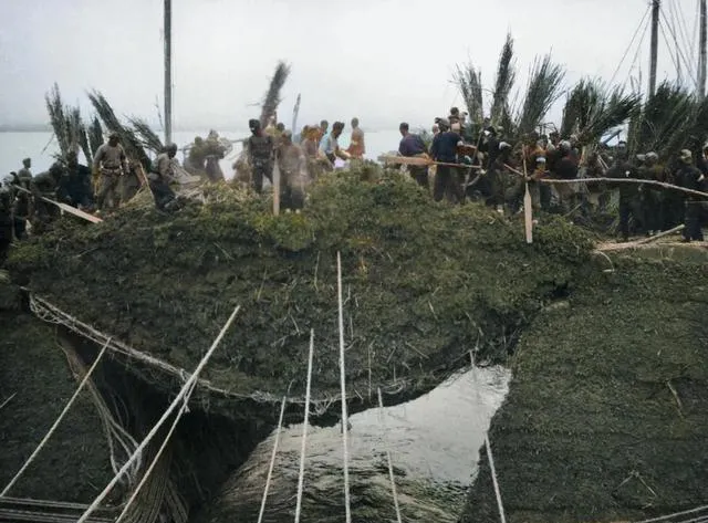 这堆起的河面叫草排桥,柳条捆扎成墩,薄雾一罩,站在上面心里也打鼓,可就是靠双手把通路搭起来,旁边一队人肩扛水泥管,前后喊着号子,脚下钉着草鞋,汗珠一落地就冒泥点子,年轻人问有起重机吗,爸摆摆手说,那会儿靠肩膀吃饭。