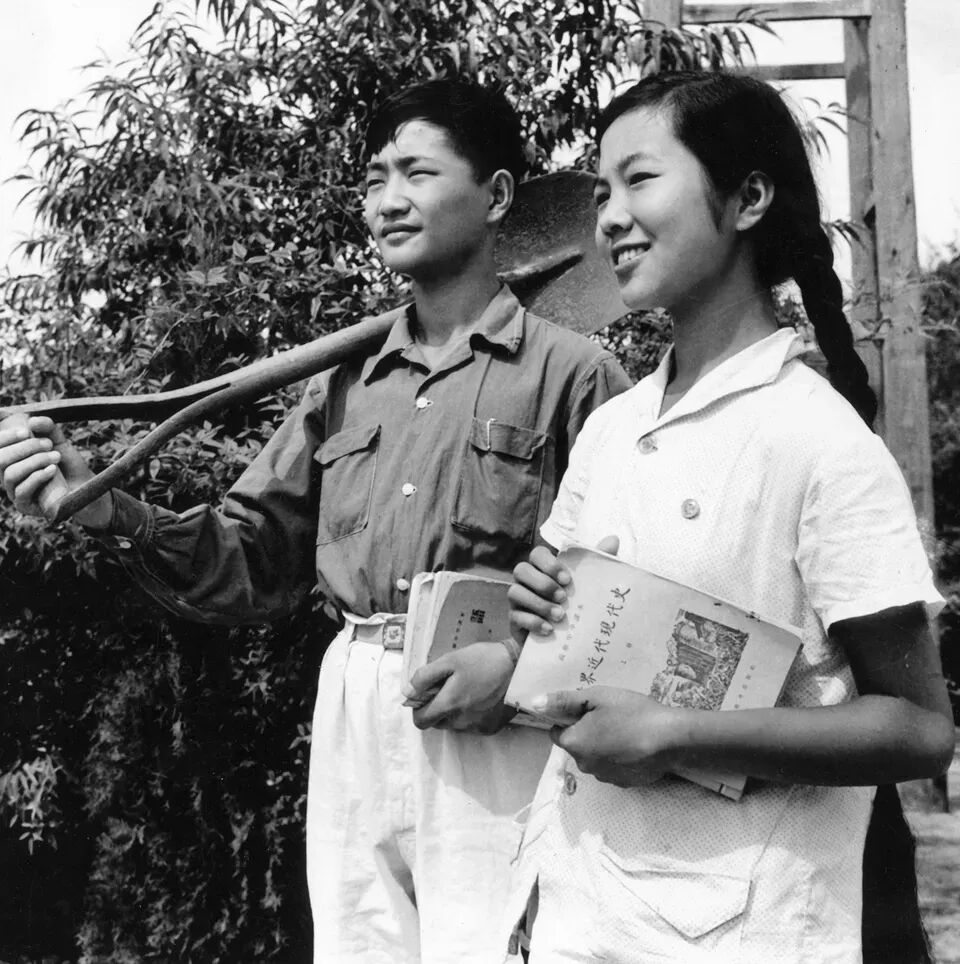 1.20世纪50年代的结婚照,铁锹是女方的嫁妆,书本是男方的彩礼,知识和生产双结合。