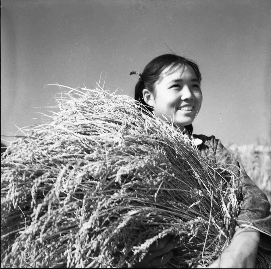 4.姑娘抱着粮食,露出丰收的喜悦。