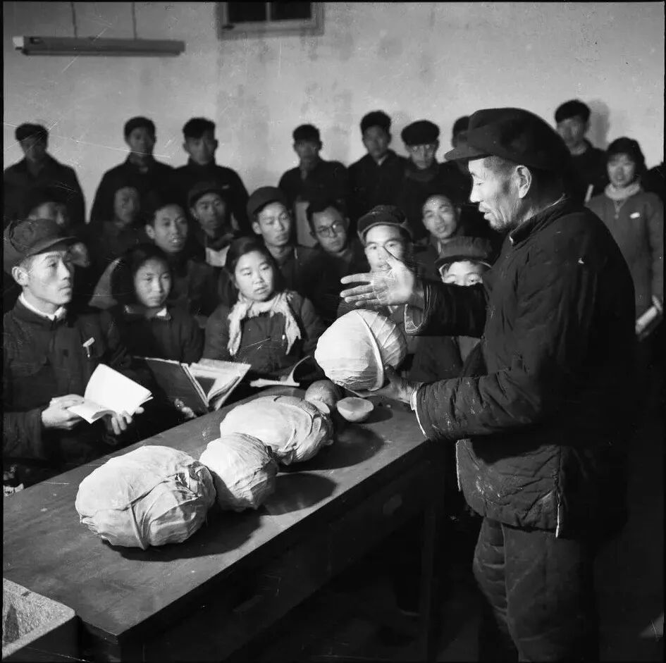 7.农民劳模给大学生讲课,拿着包菜做讲解。