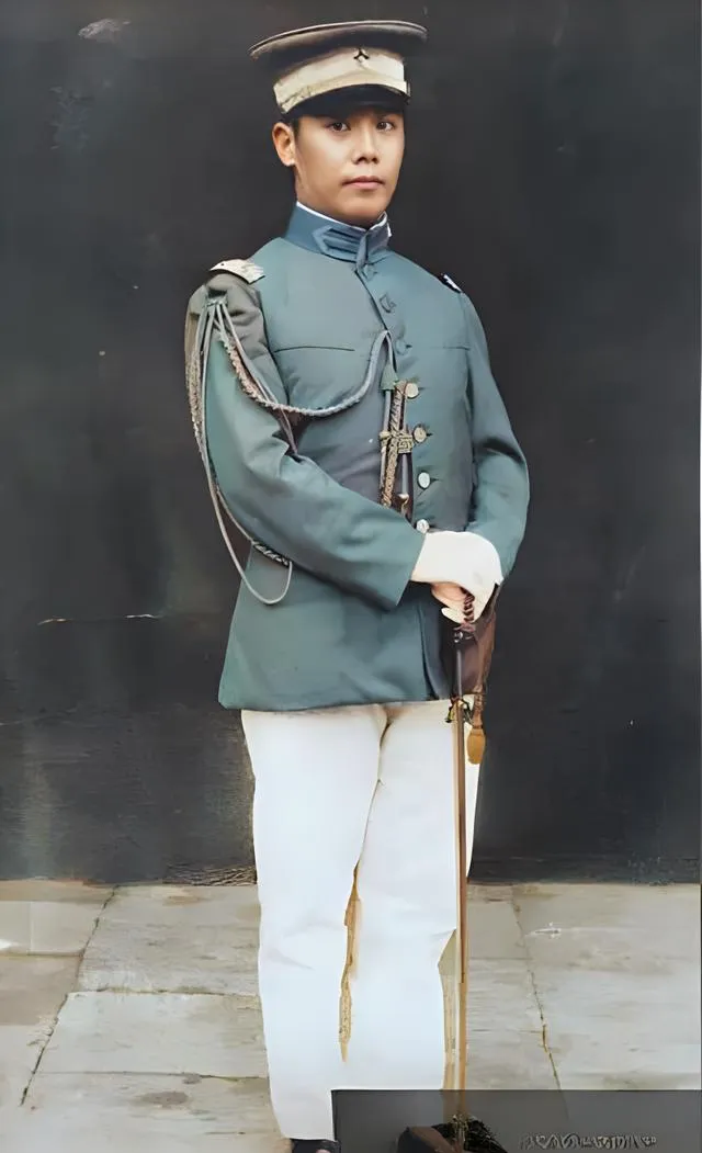 这个挺立的姿势叫戎装立影,呢制军服剪裁讲究,胸前三枚扣子压得齐整,肩头绕了一根编花肩绳,白手套罩住指节,剑穗垂在护手边,帽檐压到眉上,阴影里把眼神收得很稳,裤子是白呢马裤,小腿紧束,脚下皮靴擦得能照人。