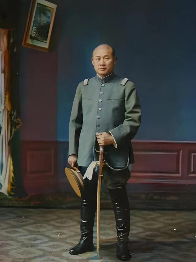 这位军人叫洪兆麟,手里拎着草帽,另一只手压着佩剑,军服是灰绿配黑靴,靴面有水波一样的亮,照相馆的地砖拼着花,墙上画框歪歪地挂着,像特意留了点生活的凌乱,他神情平静,像刚走出一场争论,决心已经落袋了。