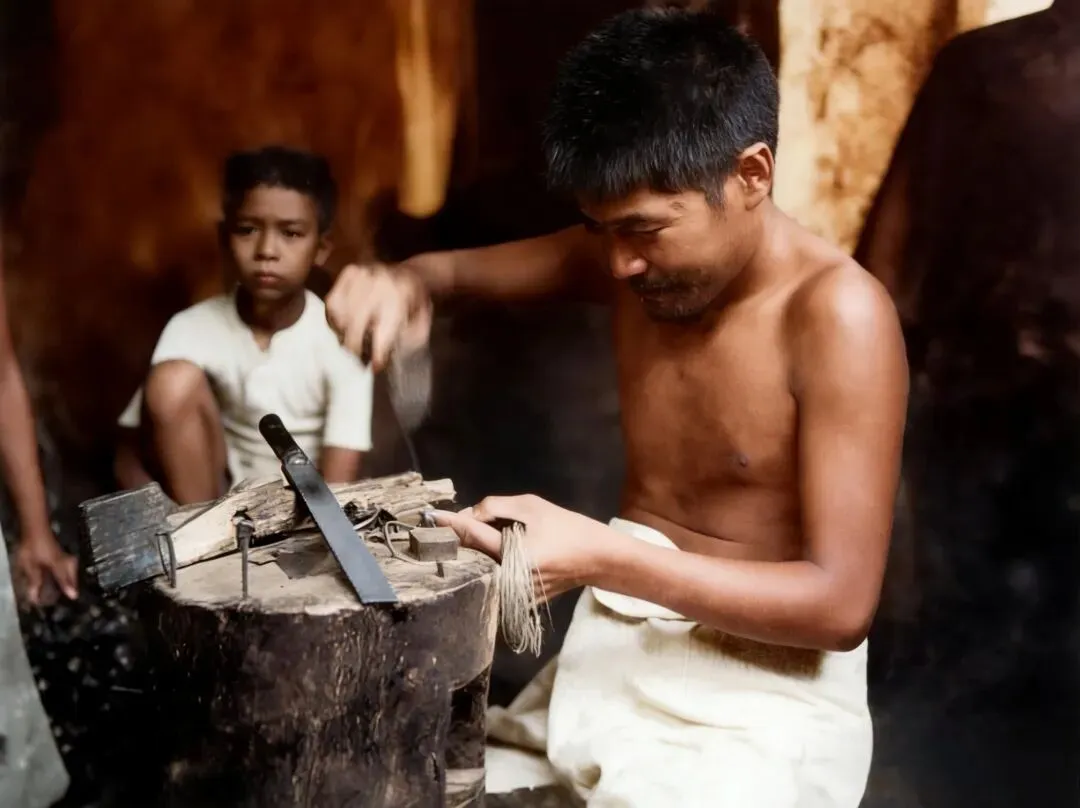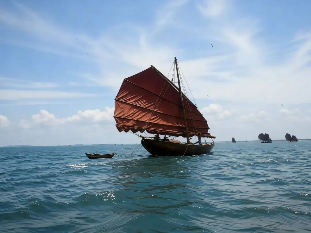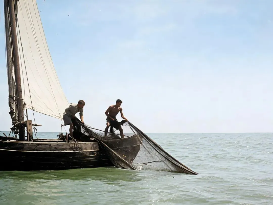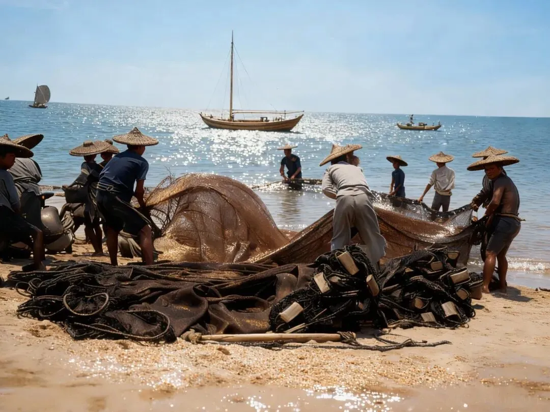 银滩的细沙上,至今残留着百年前渔民"拉大网"的绳痕。老照片里,二十余名赤膊汉子弓着脊背,将数百米长的渔网从碧海中缓缓拖曳上岸,网眼间闪烁的渔获映着晨光,如同撒落在沙滩上的碎银。这种延续千年的"讨海"方式,在清末民初依然是北海渔民的主要生计。每日潮落时分,侨港至冠头岭的海岸线上,总能看到这样的劳动场景:领头的"网头"手持铜锣,根据潮声节奏指挥众人发力,号子声与海浪拍岸声谱成最原始的渔歌。