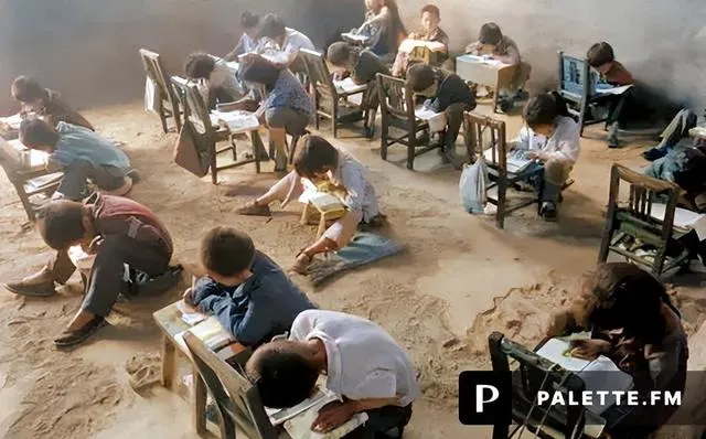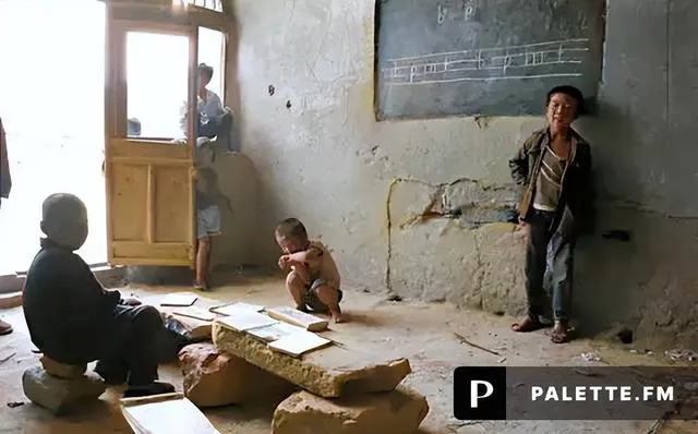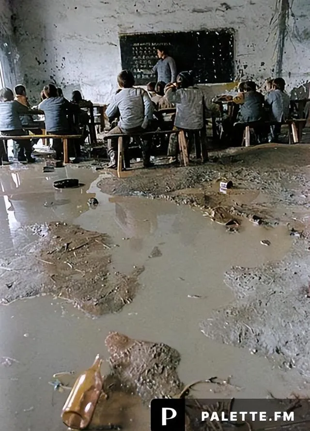 图里这间教室叫土坯屋,墙皮一块块掉,地面全是积水和烂泥,木凳子腿陷进去还吱呀作响,老师背对着窗光在黑板前写字,孩子们趴着本子,袖口和裤脚被泥巴吸住不愿松手,那时候下雨就是考验,教室漏我不漏课,换双干鞋是奢望,能抄完板书就是胜利。