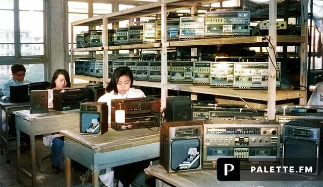 这个一层层架起来的叫老式收录机老厂的老朋友,面板上旋钮密密麻麻,女工手搭着耳机听底噪,另一只手拨到电台频段,遇到杂音就顺手拧个小电位器,灯一亮代表通过,一排排绿灯看着真解压。
