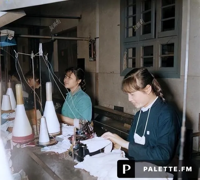 这个靠窗的位子叫包边缝纫台,锥形大线团一左一右立在铁杆上,脚下一踩踏板,针杆就像跳舞一样抖个不停,姑娘把白布折成三道边,手背贴着压脚走,缝口直得能拉一条线。