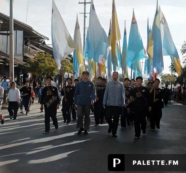 这支队伍举着彩旗过街口,旗布在阳光里透亮,风一鼓像波浪,人群里有人穿对襟褂子有人背邮差包,厂里评先进或者迎新设备,总要这么热闹地走一圈。