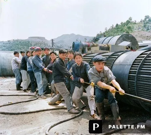 这根粗得吓人的钢丝绳拴着大卷筒,十几个人齐心拉着,脚下是石子地,山坡上风刮得猎猎响,指挥的冲他们摆手,喊到“一二嘿”,整排人就跟着发力,绳子上的麻套蹭得“吱啦吱啦”,那一下真能把心拽紧。