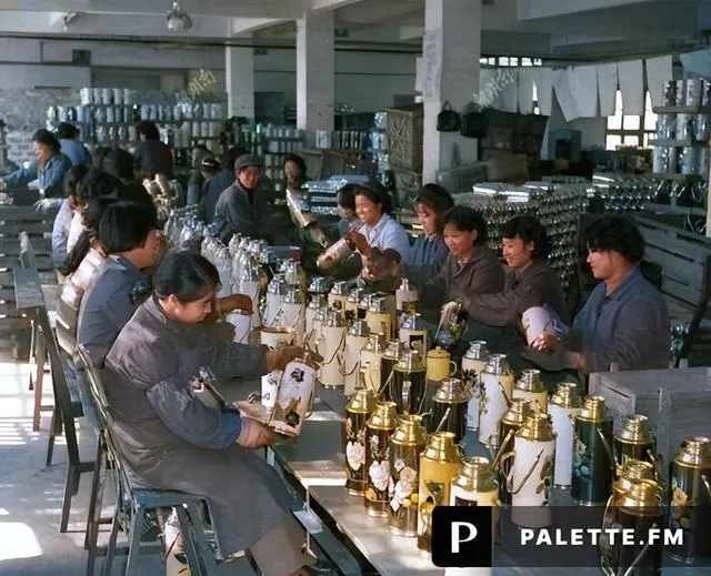 最后这一片金灿灿的是搪瓷暖水壶成型线,壶身一排排站得像小士兵,工人把花纸顺着壶肚抹平,再把壶嘴和提梁对好位,送去炉子一烤,花就“吃”进釉里了,端起来光洁照人。