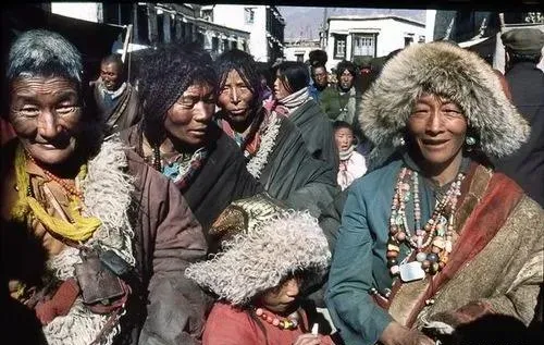 图里这一群人穿得厚重,脖子上串满了珠串和骨饰,皮袍外翻起一圈油亮的毛边,笑纹里都是高原的风沙,镜头后面是巷子和白墙,热闹是热闹,穷和富隔着一条街巷也能看出来。
