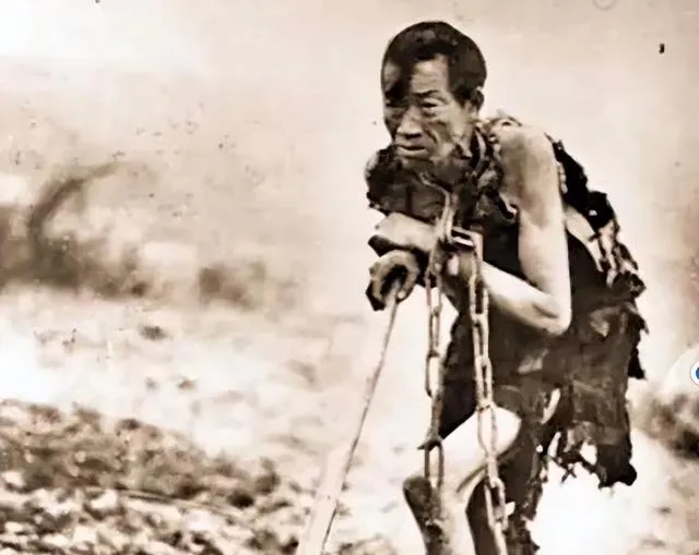 这个男人身上拖着沉链,链环粗得吓人,肩膀被磨出厚茧,手里拄着根木棒,脚踝细得像竹节,他抬眼看镜头那一刻,苦和倔全在里面。
