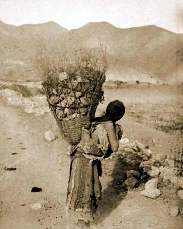 图中背着的大篓子叫竹编背篓,口大肚深,篾条粗硬,顶端没有收口,为的是多装点柴草和石子,肩带勒出两道沟,走一步晃一步,膝盖像旧门铰,吱呀作响。