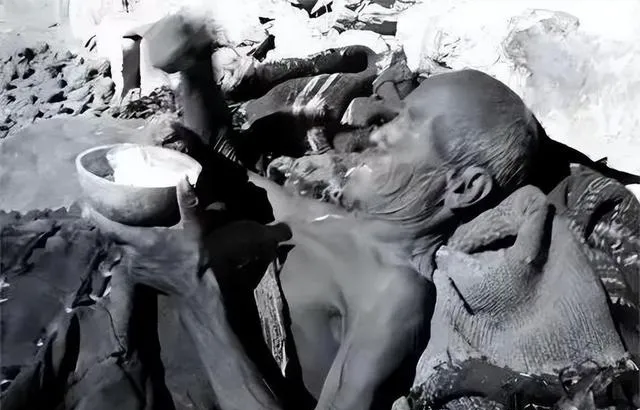 老人躺着端着一只木碗,碗沿磕得坑坑洼洼,舀一勺往嘴里送,手还在抖,骨头根在皮下突突的,旁边堆着破毯子,一阵风过来,碗里就落了沙子。