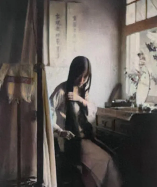 图中这只铜色盒子叫镜匣,翻盖上头蒙着灰,边角起了绿锈,旁边那把细齿木梳是梳篦,齿密得很,理到发根都能听见轻轻的哒啦声,她手里捏着的就是它,顺着长发一寸寸往下拢,力气却像被抽空了。