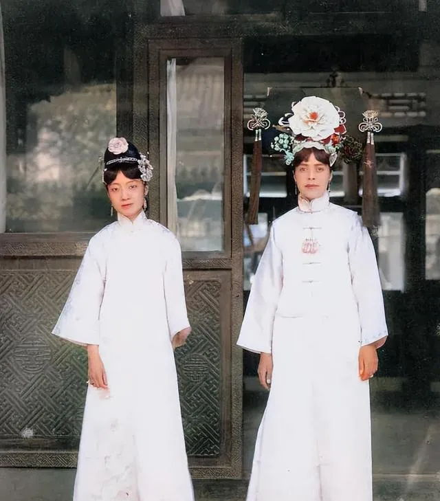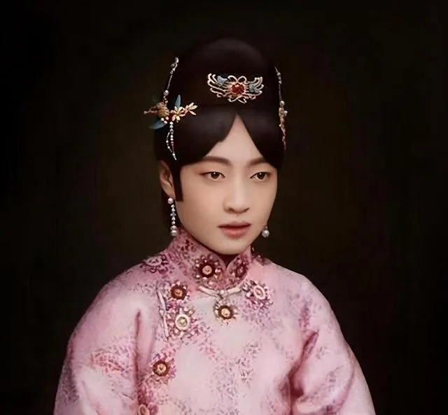 这个头上大簇大簇的装饰叫旗头,两侧坠着流苏,胸前一串圆溜溜的是朝珠,玉的温润、珊瑚的红,都是真金白银堆出来的排场,可你细看表情,笑意挂不住,规矩倒一点没落下。