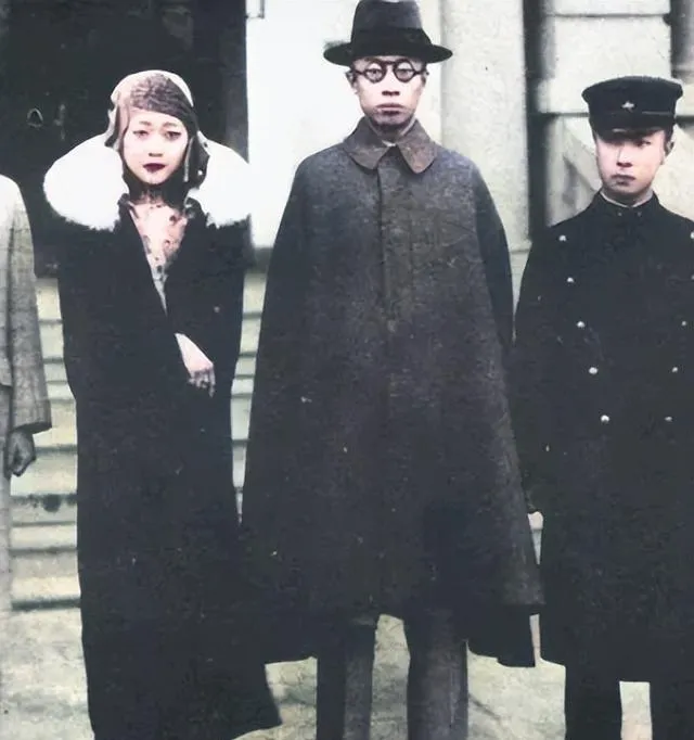 他头上的是海派毡帽,身上罩一件呢大氅,她脖子绕着白毛领,站在台阶边,风把衣角吹成三角形,照片边框有划痕,像谁匆忙塞进抽屉又拉出来。