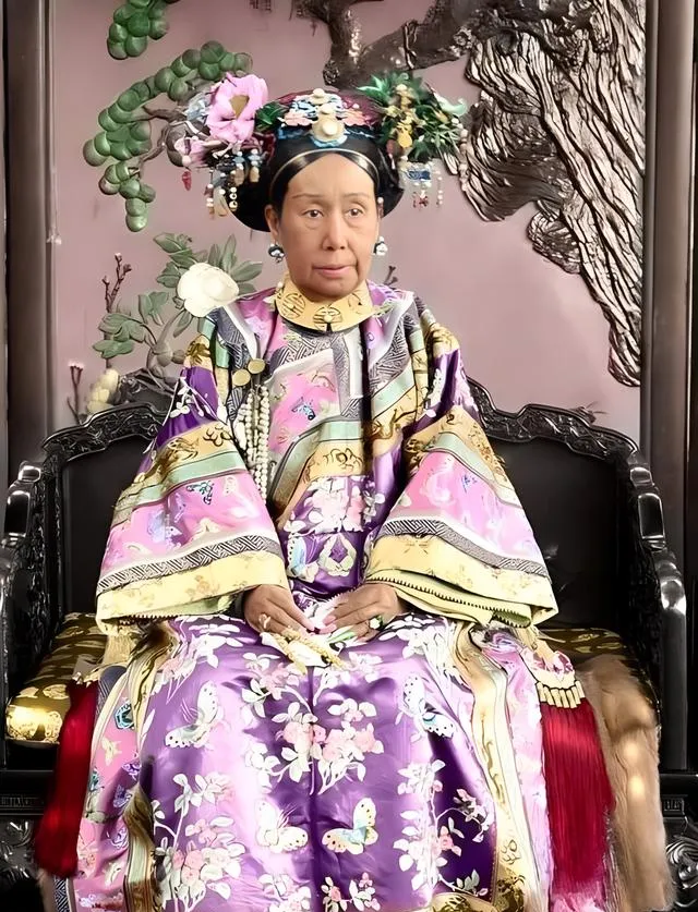 图中这位穿紫底蝶纹朝袍的叫慈禧太后,衣料是亮闪的缎面,蝴蝶花团一片,胸前坠着长串东珠,手里把玩扳指,肩背绷得直直的,那股子“我说了算”的座气一下顶到你眼前,老照片里最有力量的一张就是她这类坐像。
