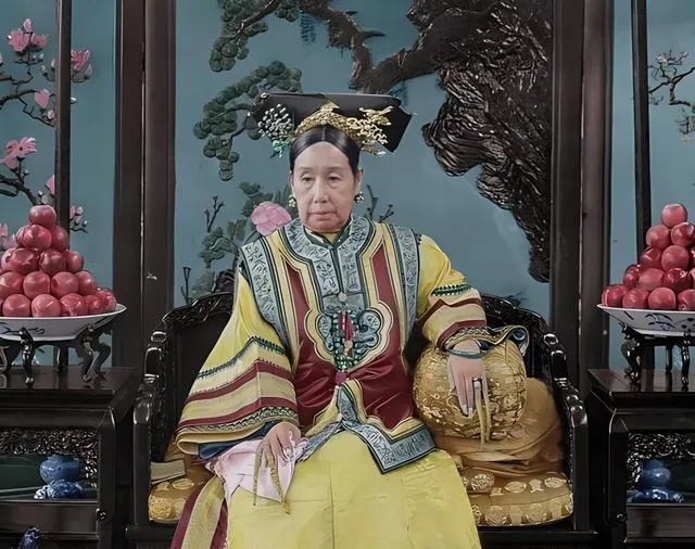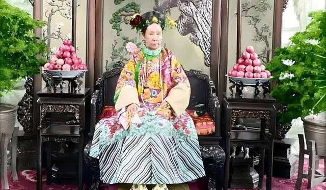 这个对座摆桃盘的场景叫祝寿陈设,两边堆得跟小山似的寿桃,红里透粉,桌案雕花深得能藏影,慈禧坐中间不笑也不怒,像在等人回话,奶奶看这张总说,一看就是“不慌不忙,先听再定”,这就是她的路数。