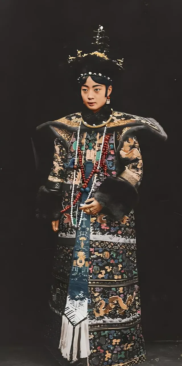 图中黑底金绣的叫婉容,年轻时五官冷静,朝服上是金线缀兽与海水江崖,腰间长垂白穗,脚边毛边厚厚的,站在黑幕前,像一盏只点自己不照人的灯,后来风雨飘摇,她这份清冷劲儿还在。