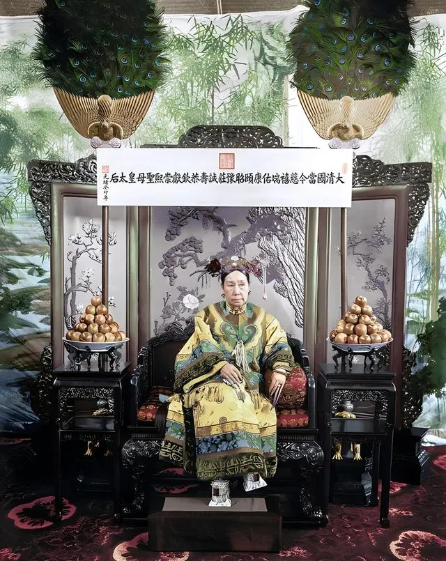 图中两把大孔雀翎立在背后叫翎扇,上头一条白匾横贯,字密密一行,慈禧坐在中间像被一层层仪式包住了,那时候讲礼先于人,现在讲人先于礼,各有各的讲法,可一入席,规矩自来。