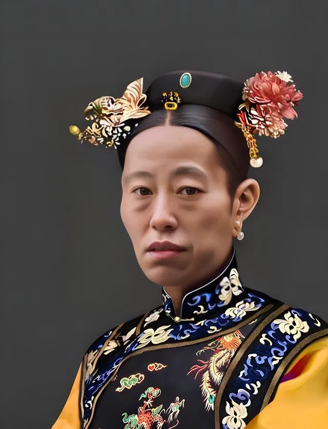 这个黑沿小帽两侧簪花的叫隆裕皇后,面相清瘦,耳边坠着珍珠,衣领是蓝黑滚金龙纹,不像慈禧那样“稳压全场”,她的神情更像在熬事,以前后位不只是好看的位子,更多是责任压肩。