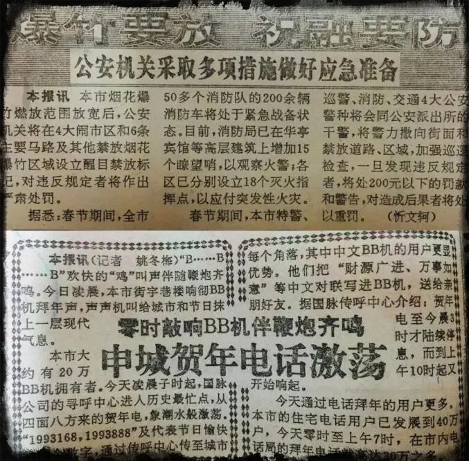1993年的新民晚报,提示爆竹要放,祝融要防。当年电话拜年、BB机拜年,如今想起来真是恍若隔世。