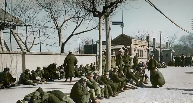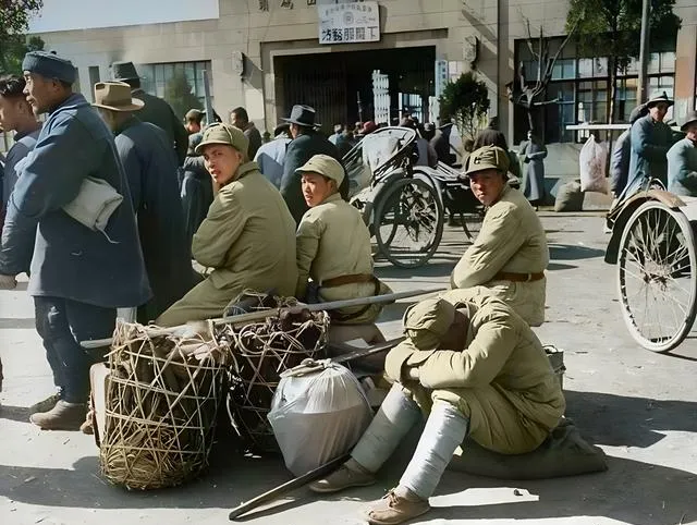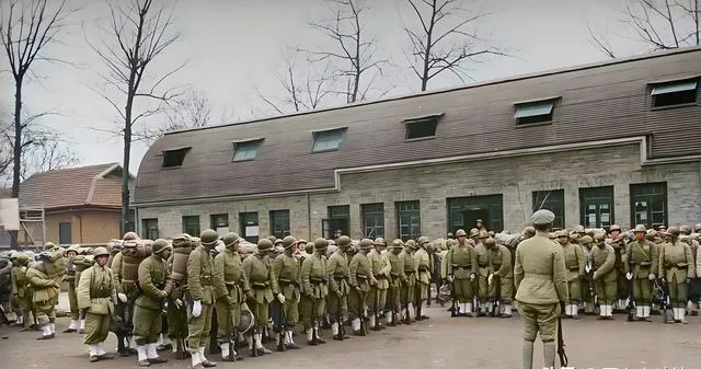 这一大片人正点名,军官的皮带闪着冷光,手里的小本子一页页翻,棕灰色的仓库墙把风挡了一半,口令短促,回声在屋檐下打了个转才散,照片里看不见紧张,可你能想见每个人都在盘算去向,去江边还是去车站,去前线还是去故乡。