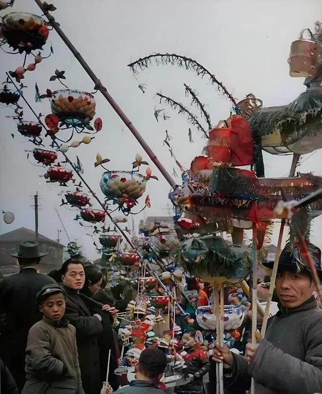 这个花里胡哨的是灯棚,木杆挑着纸扎的莲灯、鱼灯、龙凤灯,彩纸上刷了胭脂和石青,风一吹,铜铃轻轻叮当,小时候我喜欢伸手去抖那绸穗,摊主咧嘴笑说小心烫,里面点的是豆油灯芯,年味儿就靠它提起来了,以前逛灯市要攥着几张粮票换糖葫芦,现在手机上一扫,光影比灯更亮,可那股油灯味儿再也寻不回来。