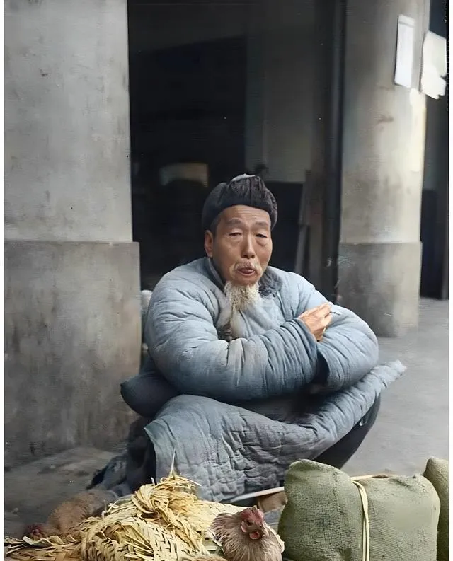 这个穿棉袍的老汉正蹲在门洞里卖土鸡,蓝布袍鼓得像棉被,胡子花白,眼角全是褶子,旁边草绳捆着一只红冠子鸡,鸡脖子伸得老长,咯咯叫了两声,他抬眼说,**“给小辈添点年菜,能换就换点米钱。”**妈妈听到这句在旁轻轻嗯了一声,以前过年桌上有一口炖鸡就算富裕,现在鸡在冰箱里躺着等解冻,热闹都在手机里。