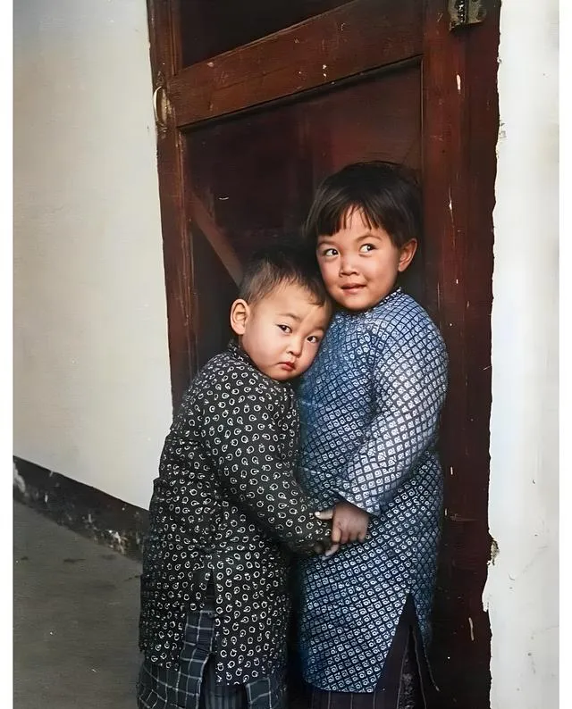 这两个抱成一团的娃穿着小棉袄,蓝底碎花和黑底小圆点,门槛上的漆起了刺,他们却笑得像偷了糖,这个场景叫依靠,一只手攥住了世界,另一只手还想去摸门缝里透进来的阳光,照片把这一秒按住了,按得我们不敢出声。