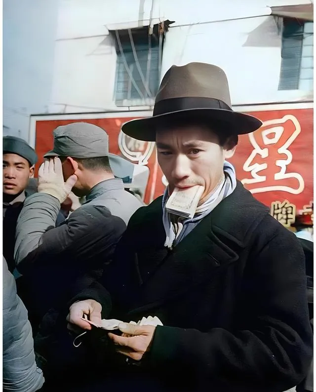 这位叼着钞票的是个讲究人,呢子大衣配毡帽,手里还捏着牙签,纸币边角被唾沫打湿了,嘴里嘟囔着数额,像在跟自己较劲,外头牌匾写着大大的字,一片红底金边,爷爷说,那会儿钱也不老实,早上一个价晚上一个价,你要是慢半拍,手里这把纸就轻了。