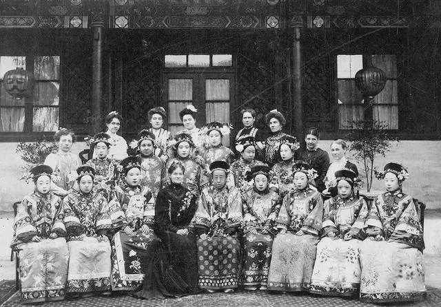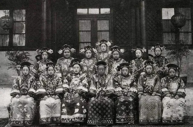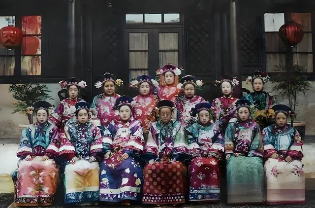 这张合影里衣料最会说话,缎面一翻就能想见手感,十二位旗装女子坐得端端正正,发上花苞像刚打了露的海棠,前排中间那位荣寿公主气定神闲,旁边绣金的小袍子泛着光,奶奶看了直咂舌,说过去嫁娶讲排场,连袖口里都绣故事。
