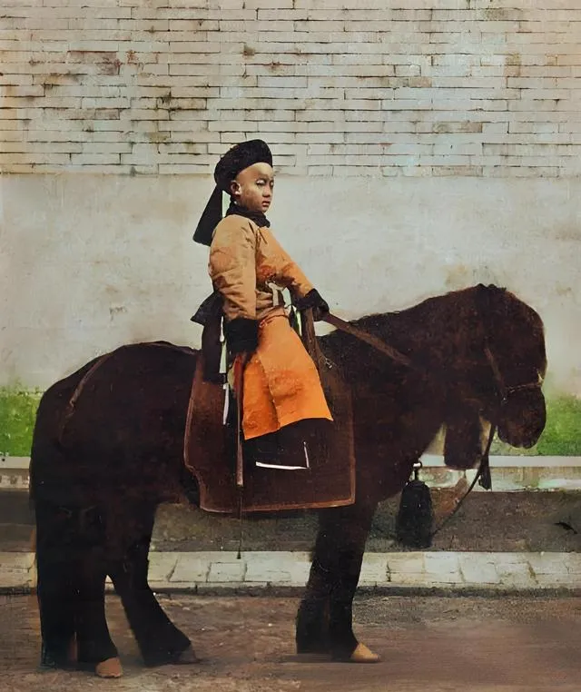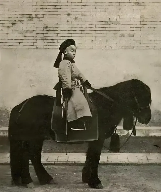 这匹小枣骝背上跨坐着个孩子,耳后别着圆圆的玉坠,半边脸在阴影里,缰绳绷着,马肚子鼓鼓的,鞍垫厚厚一层,那时候宗室子弟骑射是祖制,谁都得上马绕几圈,我小时候在巷子口学骑自行车,父亲在后头托了一把,说别怕,摔疼一次就会了,想来差不多一个理儿。