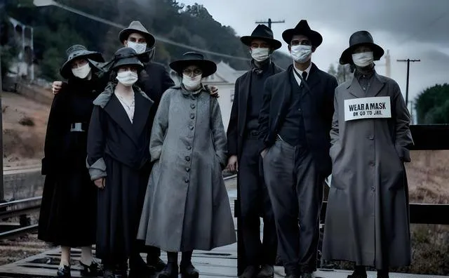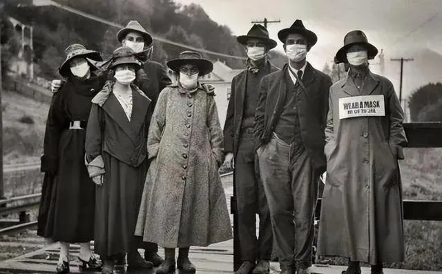 这个合影里的人穿呢子大衣、礼帽、束腰裙,胸前那块牌子最扎眼,写着**“WEAR A MASK OR GO TO JAIL”**,翻成大白话就是戴口罩否则蹲号子,那时法律说话不拐弯,照片看上去有点冷,但背后是满城的咳嗽声与紧张气氛。