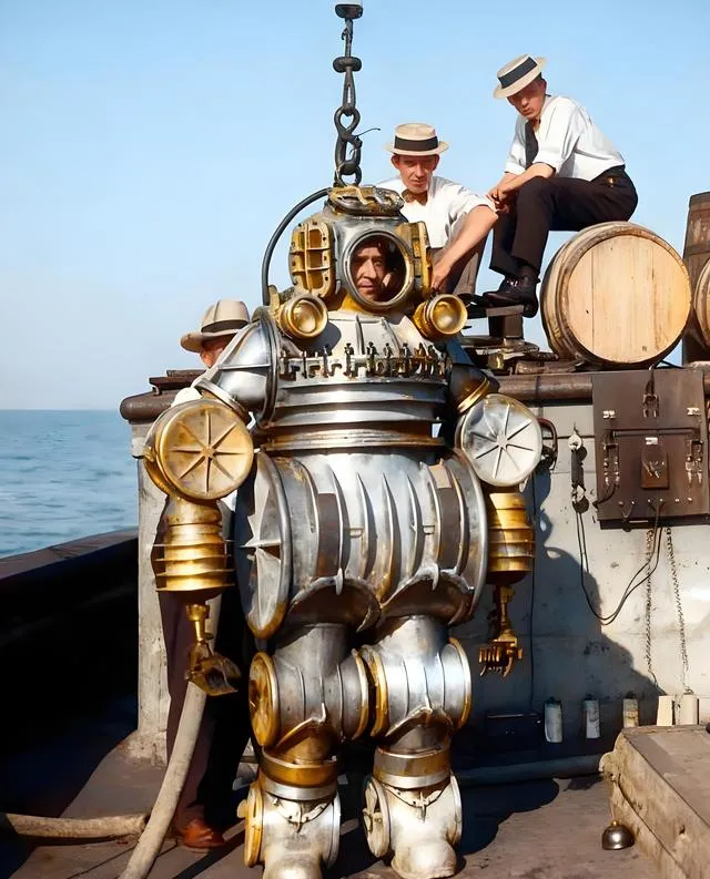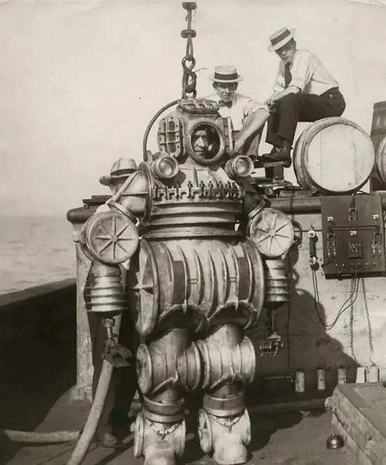 甲板上的这个家伙叫重型潜水服,金属肋板一道一道,圆形观察窗像小舷窗,臂膀上有折叠关节,腰身鼓鼓囊囊用来抗压,后背接着输气软管和电缆,穿上去人就像被装进一口竖立的铁罐里,起吊环一挂,直接放到海水里,技术还稚嫩,却是人类往深处迈的一步,听船老大说,收上来时盔面“咔哒”一开,先冒出来的是一股腥甜的海味。