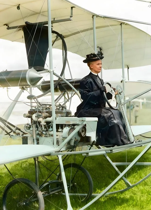 这个细杆扁翼的飞机叫早期双翼机,木头框架绑着绳索,发动机就露在一边,皮带、皮囊都看得见,座位像一张薄木椅,图里这位女士衣摆被风往后卷,她手里的曲柄就是操纵杆,脚下踏板连着副翼拉索,滑行时整架机子抖得像喘气的风箱,想想那会儿,没有导航没有玻璃罩,人就这么顶着风起飞,胆量真不小。