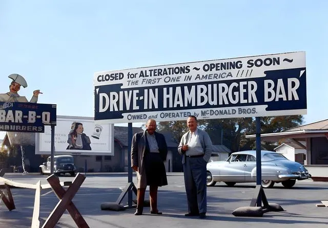 这块木牌上写着**“DRIVE‑IN HAMBURGER BAR”,还标了“OPENING SOON”**,意思是马上开张,招牌字是手涂的,白底黑字,红线加粗,站牌下面那俩人笑得挺腼腆,像是刚把厨房油烟机安好,车一进一出,拿袋就走,这种路边快食的点子,后来越滚越大,现在我们熟悉的那对金拱门,还没露头呢。