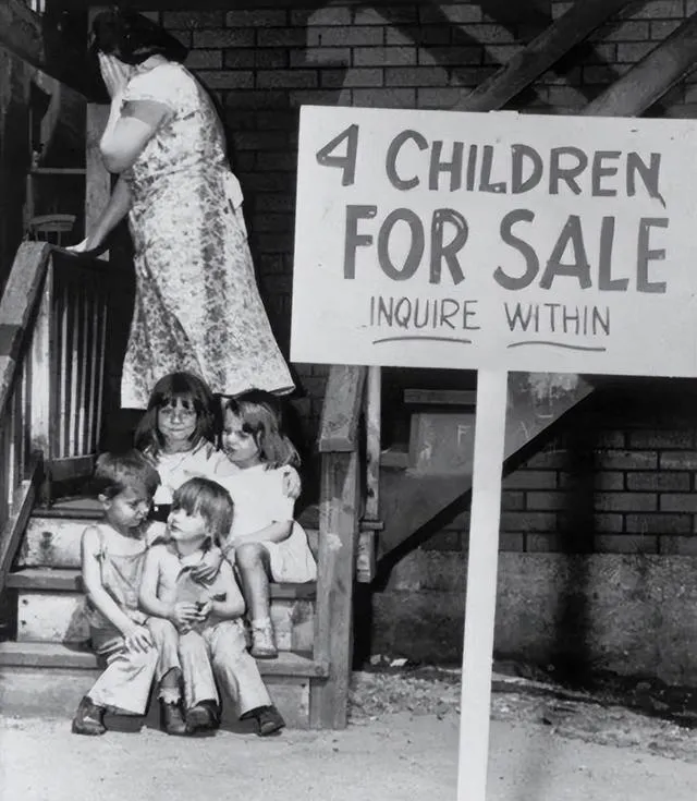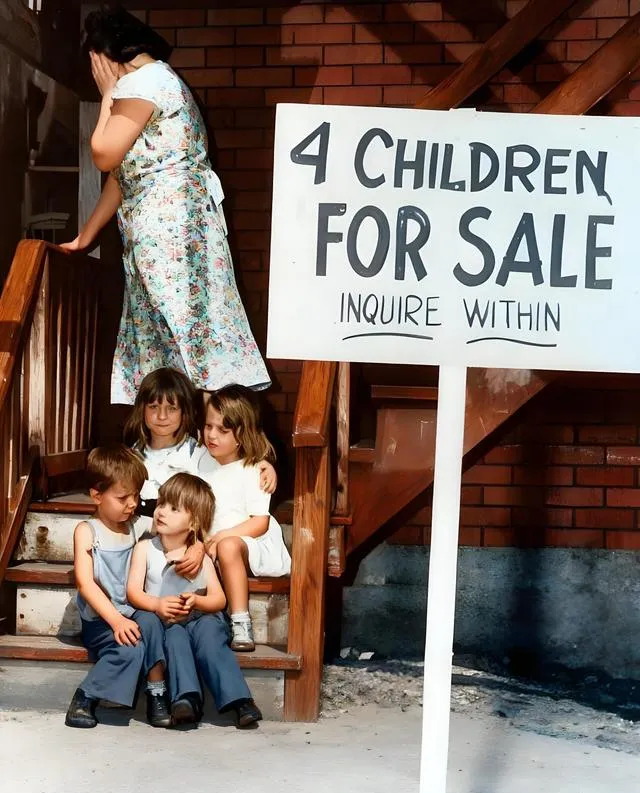 这块木牌更扎心,写着**“4 CHILDREN FOR SALE”**,楼梯上四个小家伙靠在一起,鞋子歪着,最上面那个女人用手捂着脸,装不出什么故事,也不需要装,那几年活路紧,很多家庭撑不住了,妈妈看完只叹了口气,说穷不是错,错的是没有退路。