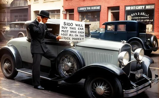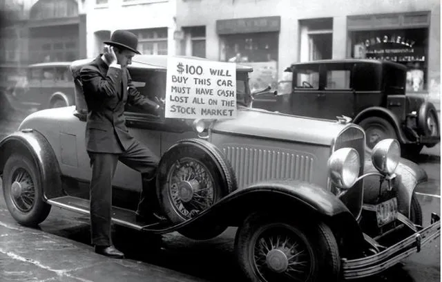 这个标牌上写得直白,“$100 WILL BUY THIS CAR”,旁边的车是豪华跑车,镀铬前脸亮得刺眼,车主衣冠整齐,手却抓着脑袋,像在算最后一笔账,行情塌了,人就被卷下去,那会儿失业潮一波一波,江湖里传一句话,风光一夜没了,车子先换口粮,这句现在听着也不陌生。