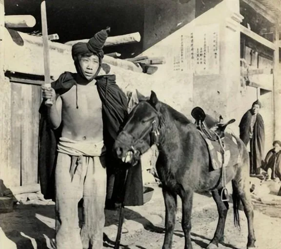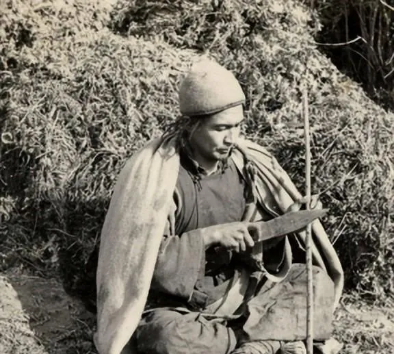 这个小伙手里的是短刀,山里人都叫腰刀,刀身黑亮,刀鞘粗糙,旁边那匹矮马配了木鞍和麻绳缰,风一来披风像黑云一样鼓起来,奶奶说那阵子娃子进城赶路,见到土司差人得靠边站,刀不敢露锋,马也不敢嘶。